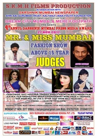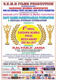 K. M. H. Films Production and Darshnik Mumbai newspaper in Association with Sri Sai Guru MaaTrust, Kalyanji Jana youth Foundation, upcoming Hindi feature film Dream City Mumbai and Mera Footpath present’s *4th Darshnik Mumbai Press Media Award 2017* ,Venue *ISKCON Auditorium, Juhu Tara Road, Iskcon Temple, Juhu, Mumbai, *28 November*, timing6 pm. to 10 pm.